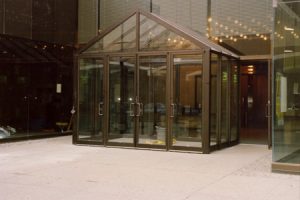 Exterior glass enclosure lobby entrance.